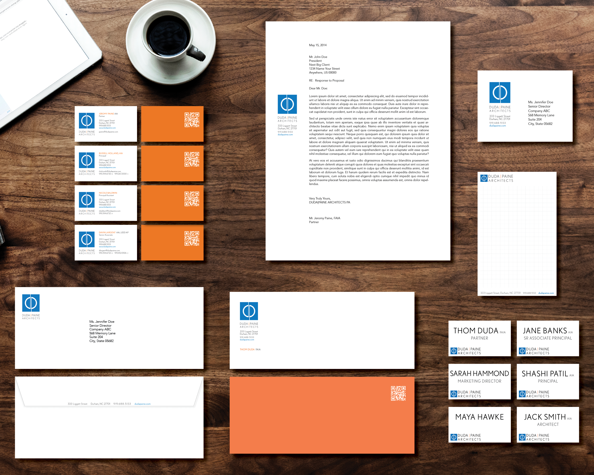 In conjunction with new Graphic Standards for Duda|Paine Architects, I refreshed the company stationery package. This comprehensive package encompasses a range of essential items, including letterheads, business cards, envelopes, thank-you cards, notecards, name tags, mailing labels, and more. Integrating the new logo into each element ensured a cohesive and visually captivating representation of the firm's brand across all communication materials. From the professionalism exuded by the letterhead to the impactful first impressions made by the business cards, this stationery package exemplifies the firm's commitment to excellence in every detail.